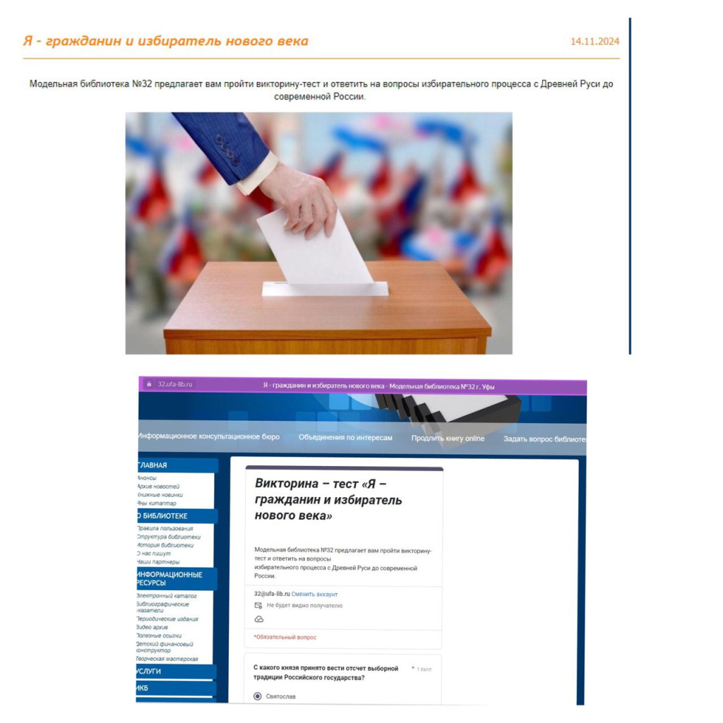 Модельная библиотека №32 Калининского района города Уфы, на своем сайте, для всех желающих, организовала интерактивную викторину, «Я-гражданин и избиратель нового века». Вопросы были подобраны в рамках повышения правовой культуры, формирования активной гражданской позиции и привлечения к участию в выборах избирателей. Организаторы викторины составили вопросы, начиная с Древней Руси и до современной России.